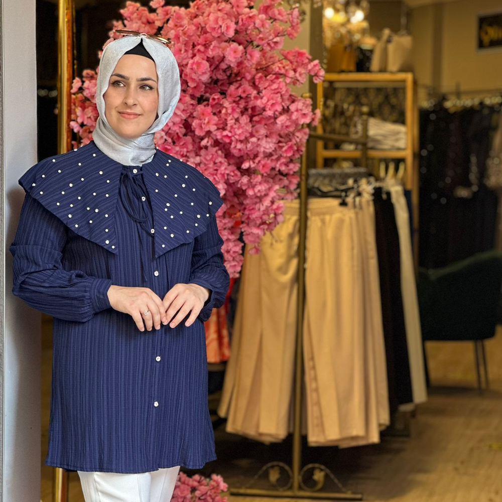 - Geniş yakası ve zarif inci detaylarıyla dikkat çeken bu tunik, şıklığı ve rahatlığı bir arada sunuyor.