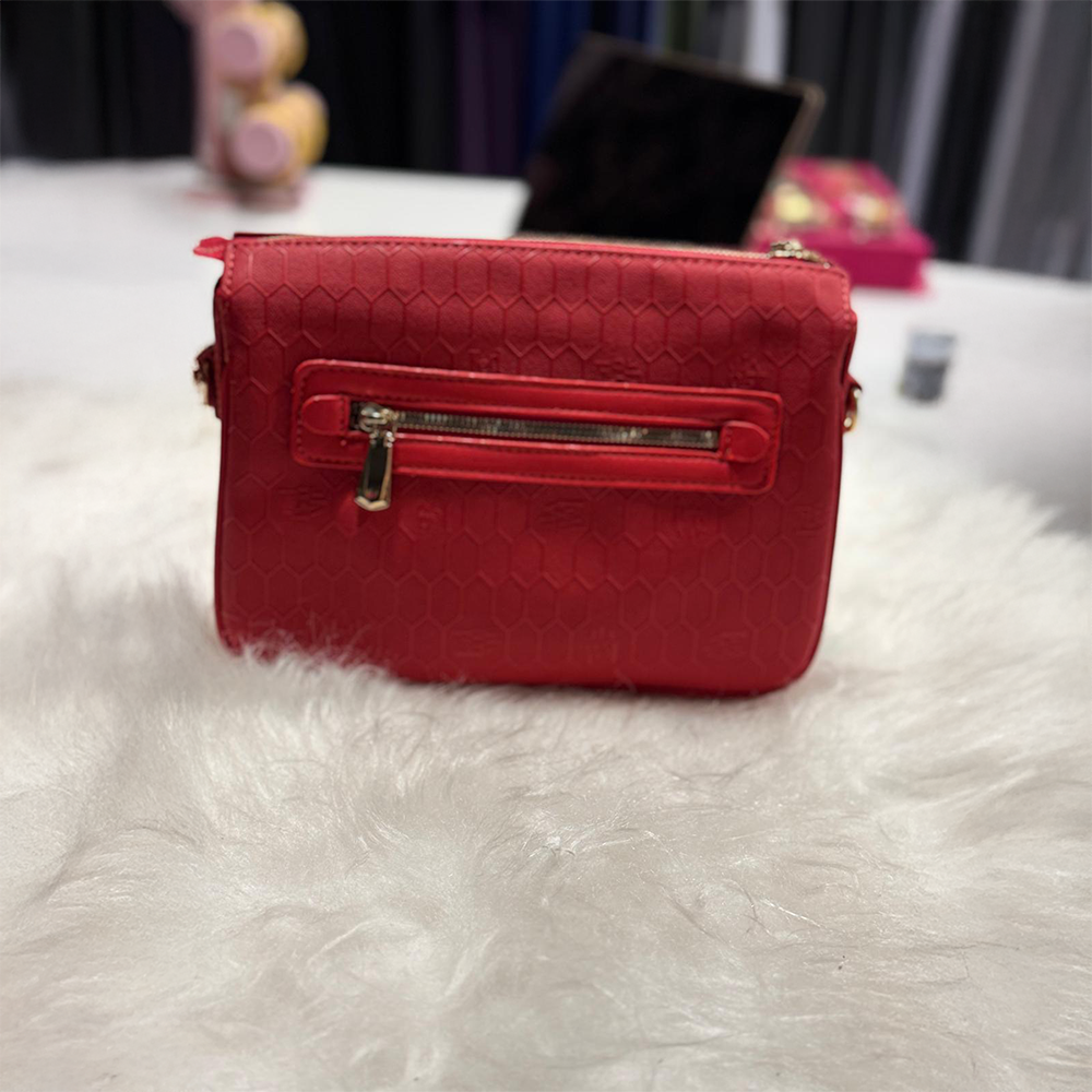 Dinamik ve dikkat çekici kırmızı print deseniyle modern çizgilere sahip bu çapraz askılı çanta, her anınıza hareket katacak.