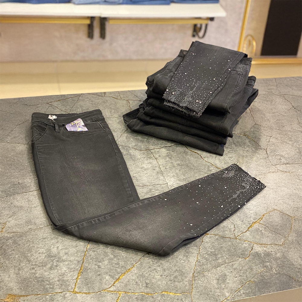 Zarif taş detaylarıyla dikkat çeken açık gri pantolon, modern ve sofistike bir görünüm sunuyor.
