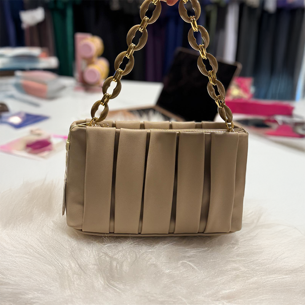 Şık vizon rengi ve zarif zincir detaylarıyla her türlü kombini tamamlayan elegan bir el çantası.